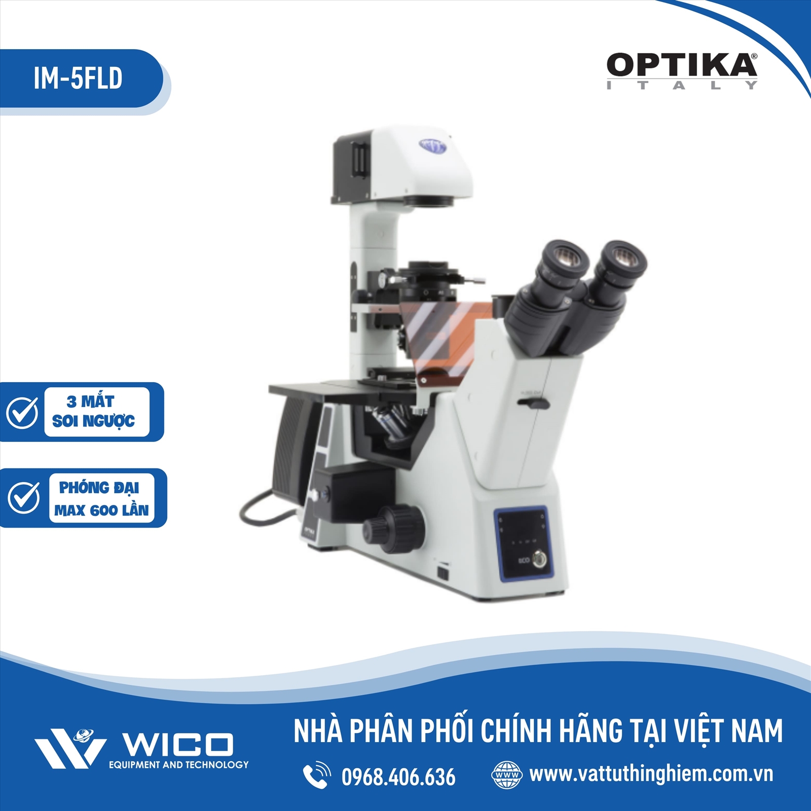 IM-5FLD là kính hiển vi soi ngược 3 mắt cao cấp do hãng Optika - Italy sản xuất. Sản phẩm được nhập khẩu và phân phối chính hãng bởi Vattuthinghiem. Vật kính cao cấp được xử lý chống nấm mốc. Kết hợp cùng thị kính 10X thị trường rộng lên tới 24mm cho độ phóng đại tối đa 600 lần. Kính được sử dụng hữu ích cho việc quan sát tế bào sống hoặc sinh vật ở đáy một vật chứa lớn, ứng dụng trong nuôi cấy thế bào, mô sống, vi sinh vật học,…